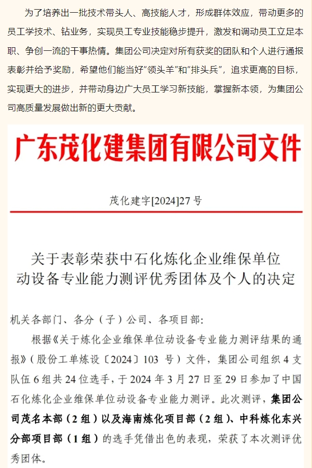 祝賀!茂化建在中石化煉化企業(yè)維保隊伍動設備實操能力測評中成績優(yōu)異,名列前茅